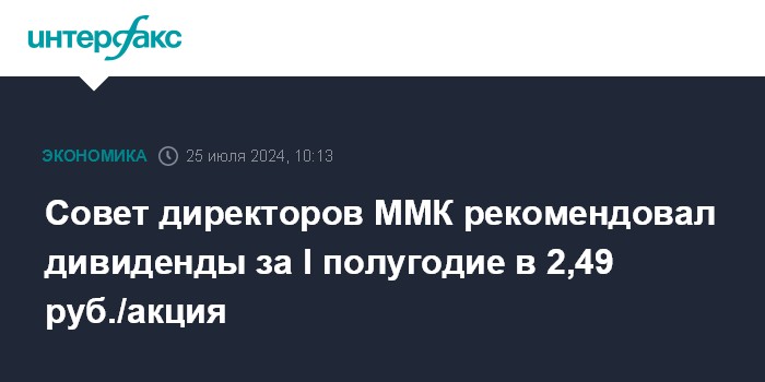 Москва. 25 июля. INTERFAX.RU - Совет директоров ПАО "Магнитогорский металлургический комбинат" рекомендовал выплатить за первое полугодие дивиденды в размере 2,494 руб. на акцию, говорится в сообщении компании.