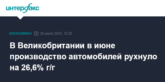 Москва. 25 июля. INTERFAX.RU - В Великобритании в июне производство автомобилей снизилось на 26,6% в годовом исчислении - до 62 231, по данным Общества производителей и продавцов автомобилей (SMMT).