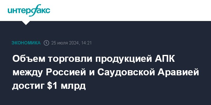 Объем торговли продукцией АПК между Россией и Саудовской Аравией достиг $1 млрд