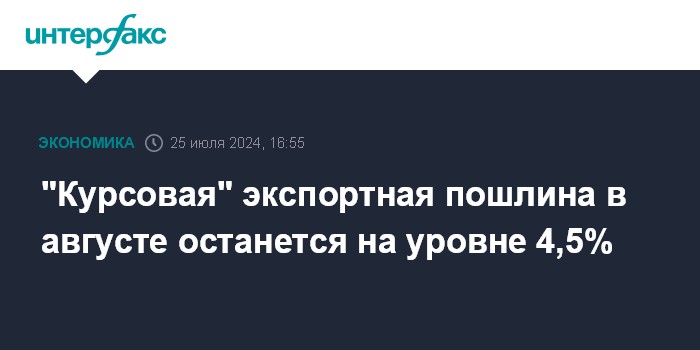 Москва. 25 июля. INTERFAX.RU - Привязанная к курсу доллара экспортная пошлина на широкую номенклатуру товаров с 1 по 31 августа 2024 года останется на уровне 4,5%, говорится в сообщении Минэкономразвития РФ.