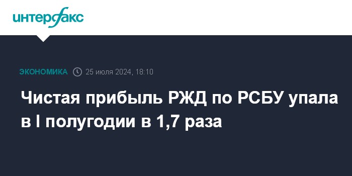 Чистая прибыль РЖД по РСБУ упала в I полугодии в 1,7 раза