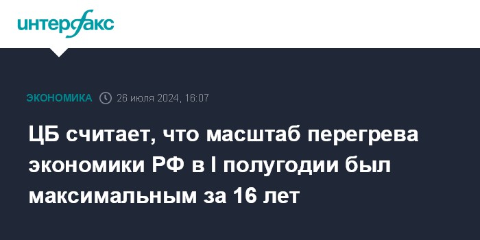 ЦБ считает, что масштаб перегрева экономики РФ в I полугодии был максимальным за 16 лет