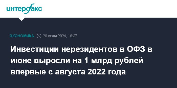 Инвестиции нерезидентов в ОФЗ в июне выросли на 1 млрд рублей впервые с августа 2022 года