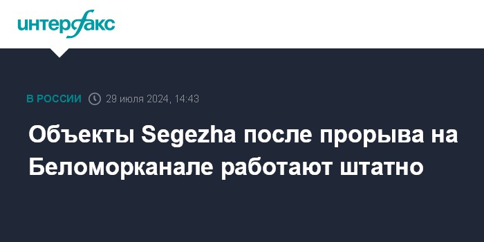 Москва. 29 июля. INTERFAX.RU - Карельские предприятия лесопромышленного комплекса Segezha Group после повреждения дамбы на Беломорско-Балтийском канале работают в штатном режиме, сообщили "Интерфаксу" в пресс-службе компании.