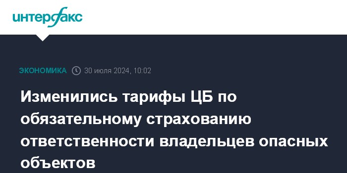 Москва. 30 июля. INTERFAX.RU - Новые тарифы Банка Рoссии по обязательному страхованию гражданской ответственности владельцев опасных объектов (ОСОПО) вступили в силу и начинают применяться по заключенным договорам с 30 июля 2024 года, в соответствии с указанием регулятора.