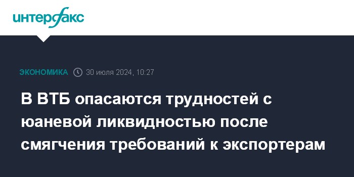 В ВТБ опасаются трудностей с юаневой ликвидностью после смягчения требований к экспортерам