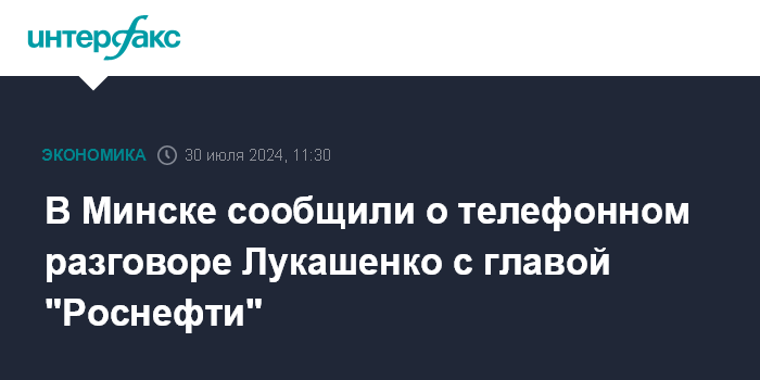 Москва. 30 июля. INTERFAX.RU - Президент Белоруссии Александр Лукашенко 30 июля поговорил по телефону с председателем правления и главным исполнительным директором "Роснефти" Игорем Сечиным, сообщил близкий к президентской пресс-службе телеграм-канал "Пул Первого".