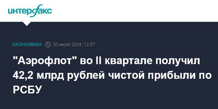 Москва. 30 июля. INTERFAX.RU - "Аэрофлот" во II квартале 2024 года получил 42,2 млрд рублей чистой прибыли по РСБУ против чистого убытка в размере 48 млрд рублей за тот же период 2023 года, сообщила компания.