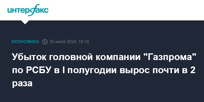 Москва. 30 июля. INTERFAX.RU - Чистый убыток головной компании ПАО "Газпром" по российским стандартам бухгалтерской отчетности (РСБУ) в первом полугодии 2024 года составил 480,641 млрд рублей после 255 млрд руб. убытка за январь-июнь 2023 года, сообщается в отчетности ПАО.