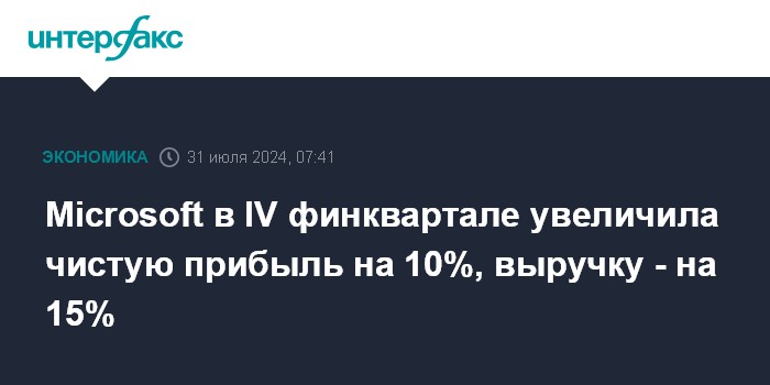 Москва. 31 июля. INTERFAX.RU - Американская Microsoft Corp. в четвертом квартале 2024 финансового года увеличила чистую прибыль на 10%, выручку - на 15%, при этом оба показателя оказались лучше ожиданий аналитиков, которых, однако, разочаровали результаты облачного сервиса Azure.