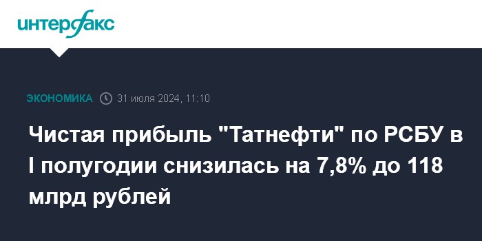Москва. 31 июля. INTERFAX.RU - Чистая прибыль "Татнефти" по РСБУ в I полугодии 2024 года снизилась на 7,8% по сравнению с аналогичным периодом предыдущего года – до 118 млрд рублей, говорится в отчете компании.