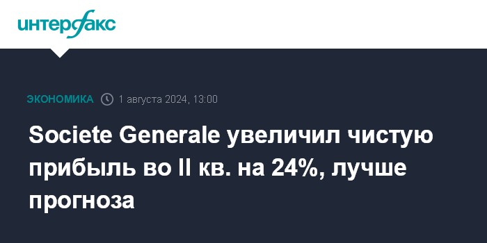 Москва. 1 августа. INTERFAX.RU - Французский банк Societe Generale SA увеличил чистую прибыль во втором квартале 2024 года на 24%, выручку - на 6%.