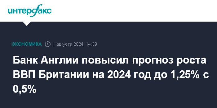 Москва. 1 августа. INTERFAX.RU - Банк Англии повысил прогноз роста ВВП Великобритании на 2024 год до 1,25% с ожидавшихся в мае 0,5%.