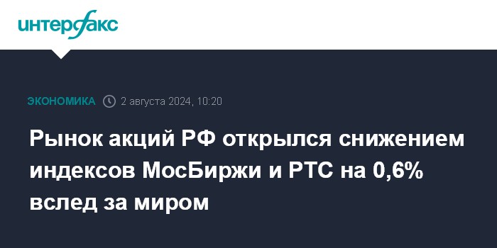 Рынок акций РФ открылся снижением индексов МосБиржи и РТС на 0,6% вслед за миром