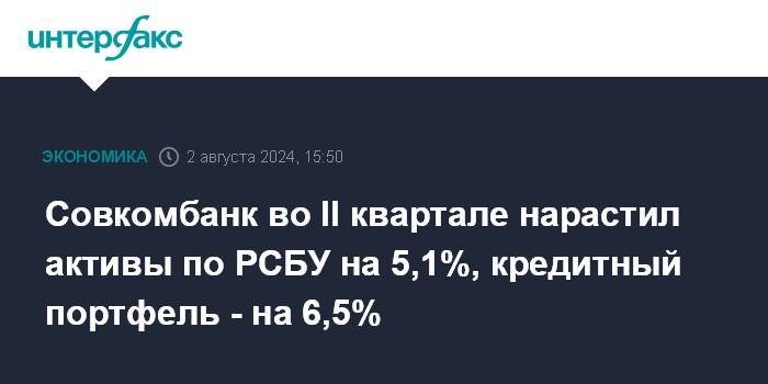 Совкомбанк во II квартале нарастил активы по РСБУ на 5,1%, кредитный портфель - на 6,5%
