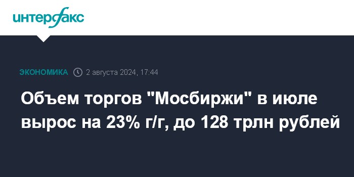 Объем торгов "Мосбиржи" в июле вырос на 23% г/г, до 128 трлн рублей