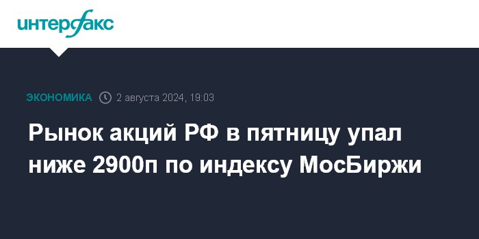 Москва. 2 августа. INTERFAX.RU - Рынок акций РФ в пятницу остался под давлением продавцов на фоне резкого ухудшения внешней фондовой конъюнктуры, снижения нефти (Brent упала к $77 за баррель) и нежелания игроков увеличивать позиции перед выходными; индекс МосБиржи откатился ниже рубежа 2900 пунктов, обновив на закрытие сессии минимум с июля 2023 года. В лидеры отката вошли акции банка "Санкт-Петербург" (-3,9%), "Мечела" (-2,5%) и упавшие на фоне слабого отчета за полугодие по РСБУ бумаги "Сургутнефтегаза" (-1,9% и -4,3% "префы").