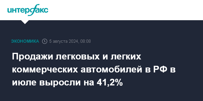 Продажи легковых и легких коммерческих автомобилей в РФ в июле выросли на 41,2%