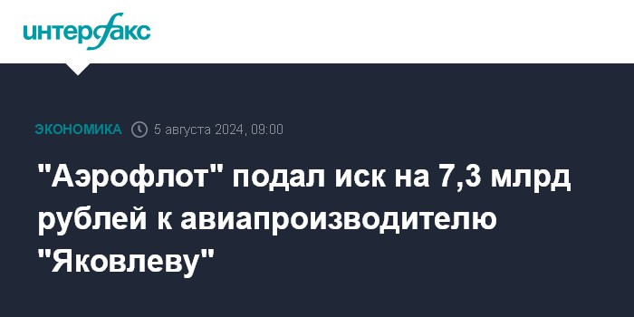 "Аэрофлот" подал иск на 7,3 млрд рублей к авиапроизводителю "Яковлеву"