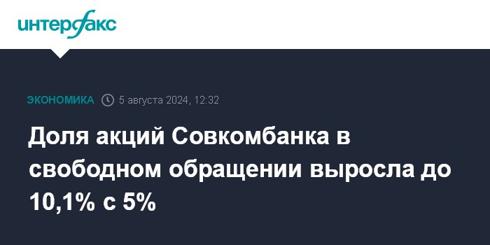 Москва. 5 августа. INTERFAX.RU - Доля акций Совкомбанка, находящихся в свободном обращении, выросла до 10,1% с 5%, следует из материалов кредитной организации.