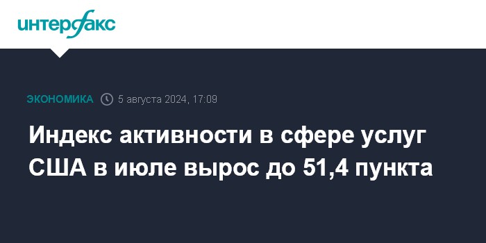 Москва. 5 августа. INTERFAX.RU - Индекс деловой активности в сфере услуг США (ISM Services) в июле поднялся до 51,4 пункта по сравнению с 48,8 пункта месяцем ранее, сообщил Институт управления поставками (ISM).