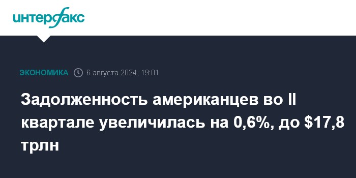 Москва. 6 августа. INTERFAX.RU - Совокупная задолженность домохозяйств США во втором квартале увеличилась на 0,6% (на $109 млрд) относительно предыдущих трех месяцев и достигла рекордных $17,8 трлн, сообщил Федеральный резервный банк Нью-Йорка.