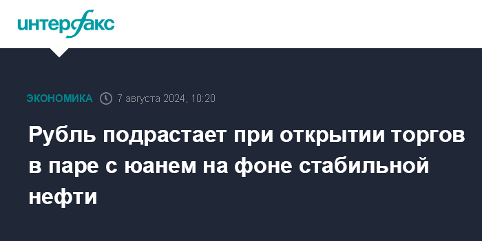 Москва. 7 августа. INTERFAX.RU - Китайский юань снижается на Московской бирже утром в среду, рубль дорожает на фоне стабильной нефти.