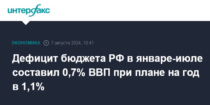 Дефицит бюджета РФ в январе-июле составил 0,7% ВВП при плане на год в 1,1%