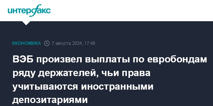 Москва. 7 августа. INTERFAX.RU - ВЭБ в августе произвел выплаты ряду держателей еврооблигаций, чьи права учитываются иностранными депозитариями, сообщила госкорпорация.