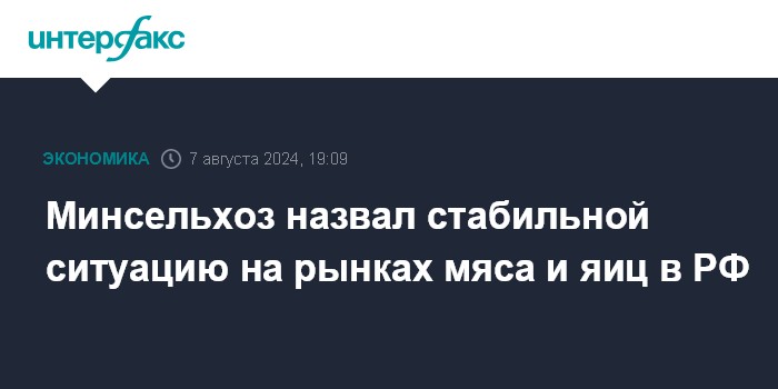 Москва. 7 августа. INTERFAX.RU - Ситуация на рынках мяса и яиц стабильная, цены в оптовом сегменте снижаются, сообщает Минсельхоз.