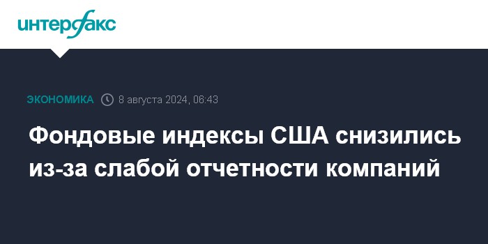 Москва. 8 августа. INTERFAX.RU - Американские фондовые индексы снизились по итогам торгов в среду из-за слабой квартальной отчетности ряда крупных компаний.
