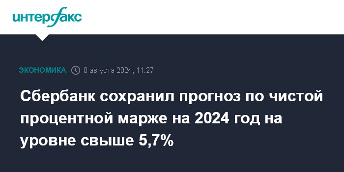 Москва. 8 августа. INTERFAX.RU - Сбербанк сохранил прогноз по чистой процентной марже на 2024 год на уровне свыше 5,7%, сказано в презентации банка к отчетности по МСФО за второй квартал.