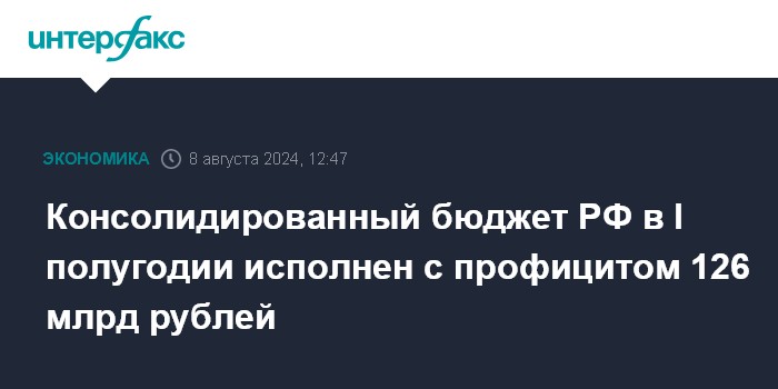 Москва. 8 августа. INTERFAX.RU - Консолидированный бюджет России в январе-июне 2024 года, по предварительной оценке, исполнен с профицитом 126,1 млрд рублей, сообщает сайт Федерального казначейства.