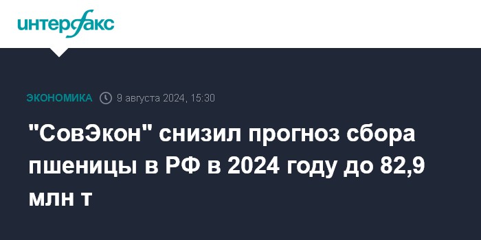 Москва. 9 августа. INTERFAX.RU - Компания "СовЭкон" снизила с 84,7 млн до 82,9 млн тонн прогноз сбора пшеницы в РФ в этом году, говорится в ее сообщении.