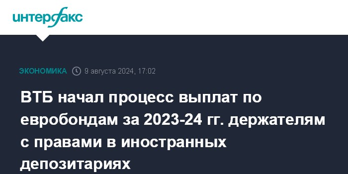 Москва. 9 августа. INTERFAX.RU - ВТБ запустил процесс выплат за 2023 и 2024 годы по долларовым еврооблигациям-2035 и евробондам в швейцарских франках с погашением в октябре 2024 года в пользу держателей, учет прав которых ведется в иностранных депозитариях, на рублевые счета, открытые в банке.