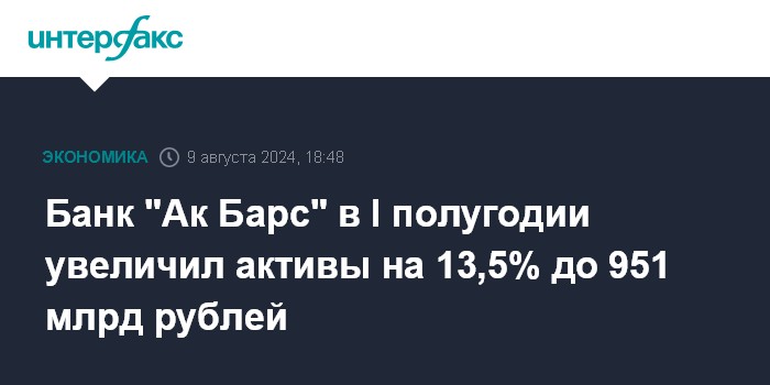Москва. 9 августа. INTERFAX.RU - Банк "Ак Барс" в первом полугодии 2024 года нарастил активы на 13,5% до 950,9 млрд рублей, говорится в отчетности кредитной организации по РСБУ.
