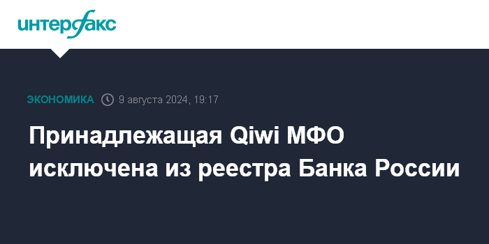 Москва. 9 августа. INTERFAX.RU - Микрофинансовая компания (МФО) "Полет финанс", принадлежащая группе Qiwi, в конце июля была исключена из госреестра МФО Банка России, свидетельствуют данные на сайте регулятора.
