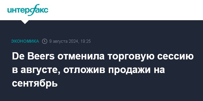Москва. 9 августа. INTERFAX.RU - Крупнейшая алмазодобывающая компания De Beers отменила свою регулярную торговую сессию в августе, отложив даты продаж на более поздний срок в этом году на фоне сохраняющегося избытка предложения в алмазной отрасли, сообщает отраслевое агентство Rapaport.