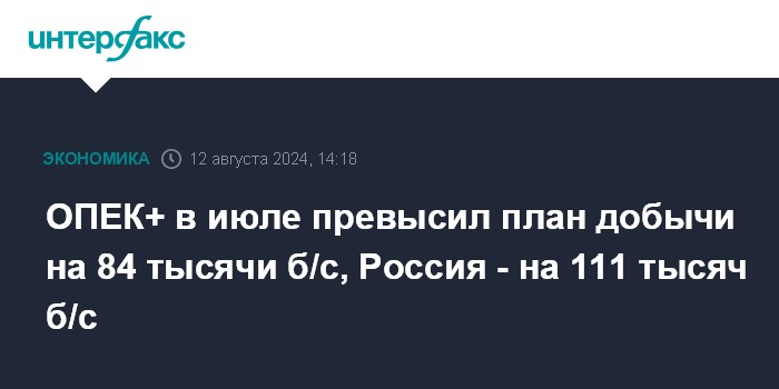 ОПЕК+ в июле превысил план добычи на 84 тысячи б/с, Россия - на 111 тысяч б/с