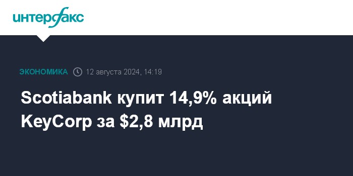 Москва. 12 августа. INTERFAX.RU - Канадский The Bank of Nova Scotia (Scotiabank) купит 14,9% акций американского регионального банка KeyCorp за $2,8 млрд. Как говорится в пресс-релизе KeyCorp, Scotiabank заплатит $17,17 за его акцию.