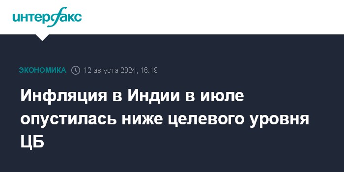 Москва. 12 августа. INTERFAX.RU - В Индии в июле рост потребительских цен замедлился до минимума с августа 2019 года, опустившись ниже целевого показателя Центробанка в 4% впервые почти за пять лет.