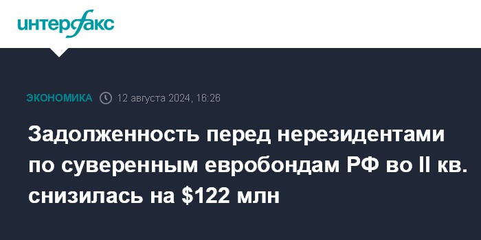 Москва. 12 августа. INTERFAX.RU - Объем задолженности по суверенным еврооблигациям РФ перед нерезидентами во втором квартале 2024 года уменьшился на $122 млн, или на 0,8%, до $14,602 млрд с $14,724 млрд, следует из информации на сайте ЦБ РФ.
