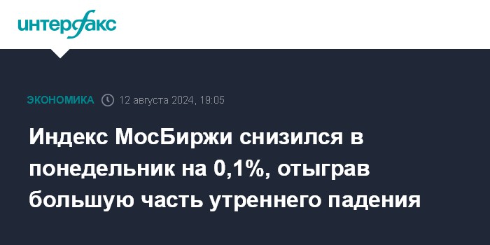 Москва. 12 августа. INTERFAX.RU - Рынок акций РФ к концу торгов понедельника отыграл большую часть утреннего падения и закрылся лишь небольшим снижением индекса МосБиржи благодаря позитивной внешней конъюнктуре, в том числе растущим ценам на нефть; индекс РТС заметно упал за счет обесценения рубля, произошедшего на торгах в пятницу и понедельник.