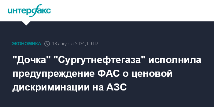 Москва. 13 августа. INTERFAX.RU - Дочернее предприятие "Сургутнефтегаза" - ООО "СО "Тверьнефтепродукт" - исполнило предупреждение Тверского УФАС о ценовой дискриминации на автозаправочных станциях и устранило признаки нарушения, сообщила пресс-служба ФАС.