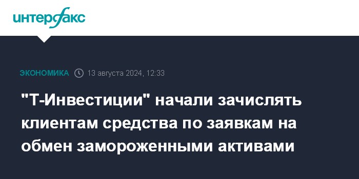 Москва. 13 августа. INTERFAX.RU - "Т-Инвестиции" получили информацию от "Инвестиционной палаты", назначенной организатором обмена заблокированными активами, о частичном исполнении заявок своих клиентов и начали зачислять полученные средства на брокерские счета, говорится в сообщении брокера.