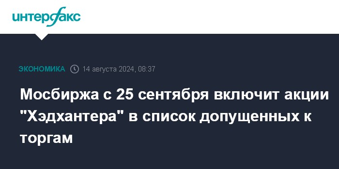 Мосбиржа с 25 сентября включит акции "Хэдхантера" в список допущенных к торгам