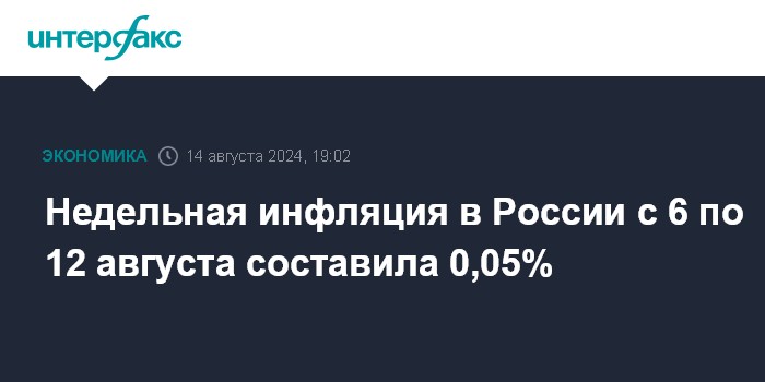 Недельная инфляция в России с 6 по 12 августа составила 0,05%