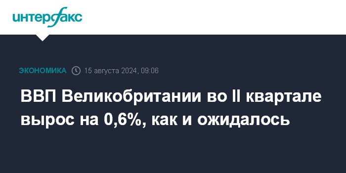 Москва. 15 августа. INTERFAX.RU - Экономика Великобритании во втором квартале 2024 года увеличилась на 0,6% по сравнению с предыдущими тремя месяцами, по предварительным данным Национального статистического управления (ONS).