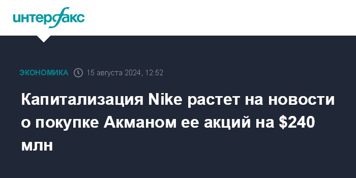 На этой новости бумаги Nike подорожали на 3,7% на предварительных торгах в четверг. Исходя из котировок на закрытие торгов в среду, Pershing Square купила ее акции на сумму около $240 млн.