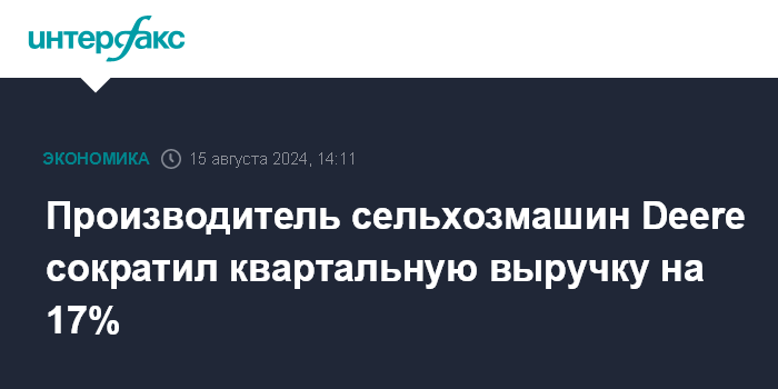 Москва. 15 августа. INTERFAX.RU - Американский производитель сельскохозяйственного оборудования Deere & Co. в третьем квартале 2024 финансового года сократил чистую прибыль на 42%, выручку - на 17%, однако показатели превзошли ожидания аналитиков.